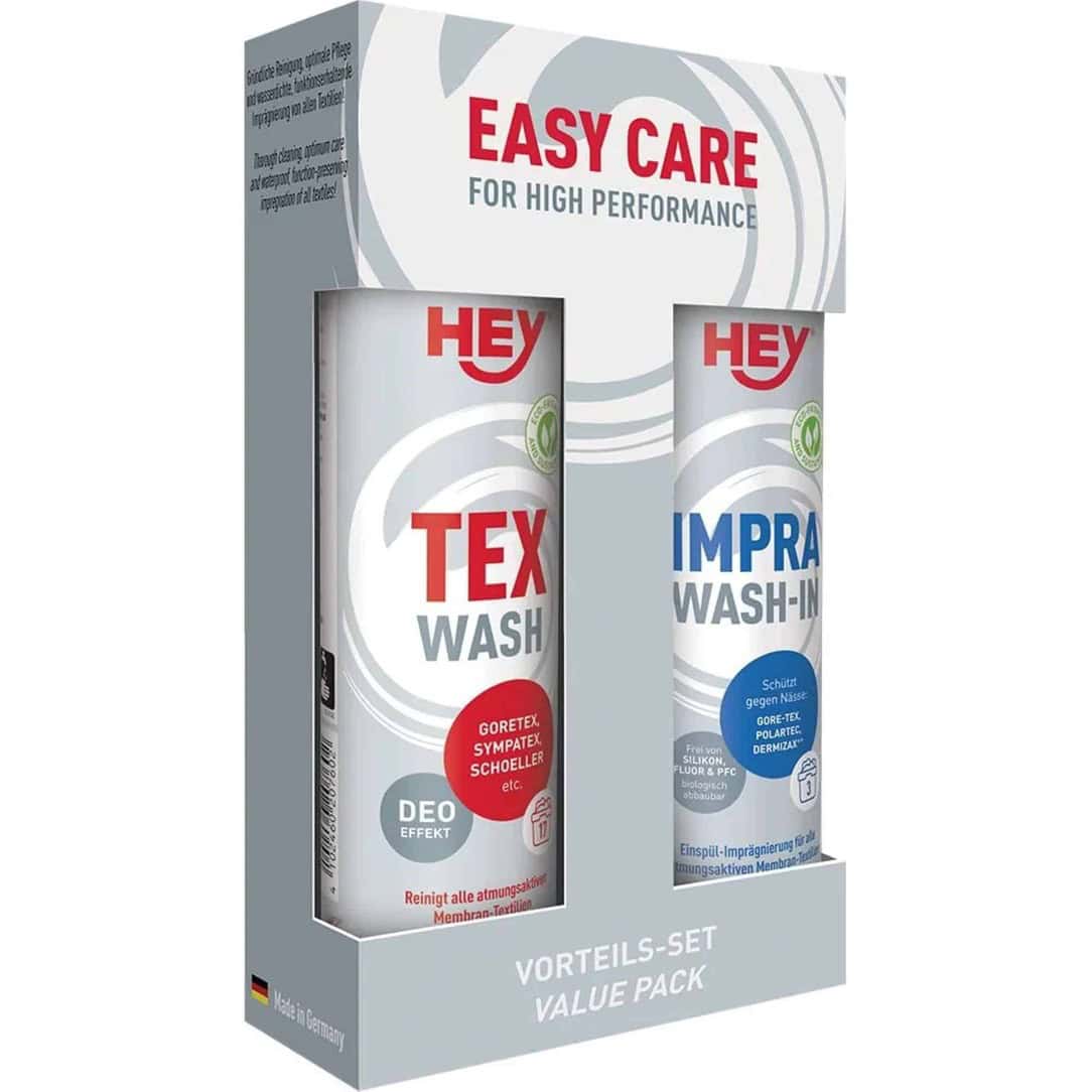 De Hey Tex Wash reinigt grondig maar zacht, zodat het ademend vermogen van de stof behouden blijft. Tegelijkertijd zorgt de Hey Impra Wash-In voor een duurzame, waterafstotende bescherming die de levensduur van je kleding verlengt. Beide producten zijn water gebaseerd en fluorvrij, waardoor ze een verantwoorde keuze zijn voor jou én het milieu. Ook zijn ze speciaal afgestemd op ademende functionele stoffen zoals Gore-Tex®, softshell, fleece en sporttextiel. Zo blijven de waterafstotende eigenschappen en de ademende werking behouden, zelfs na veelvuldig wassen.